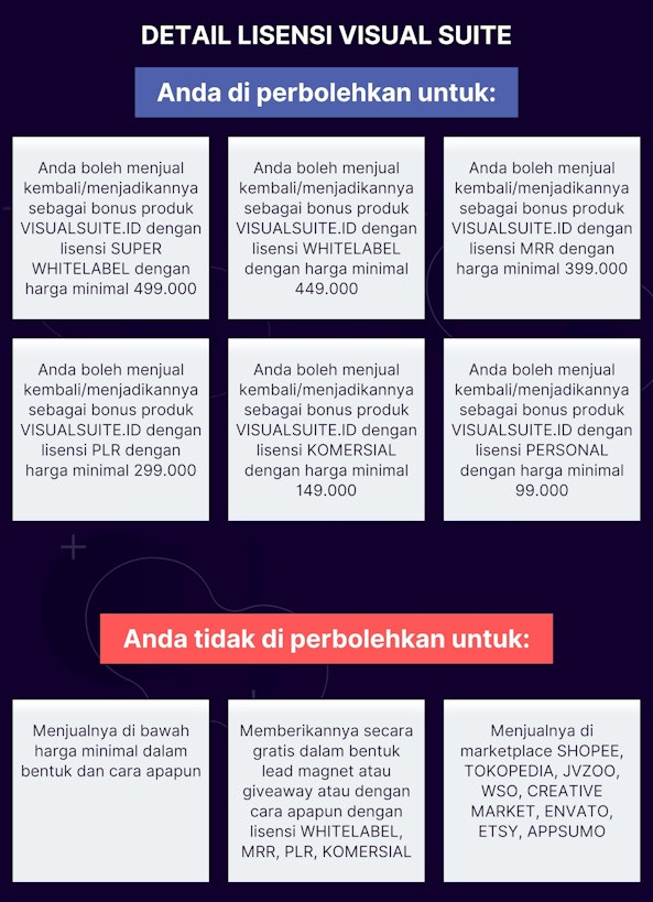 Anda boleh menjual kembali produk dan template-template VISUALSUITE.ID kepada orang lain. 100% keuntungan menjadi milik Anda